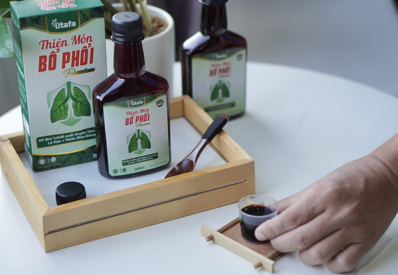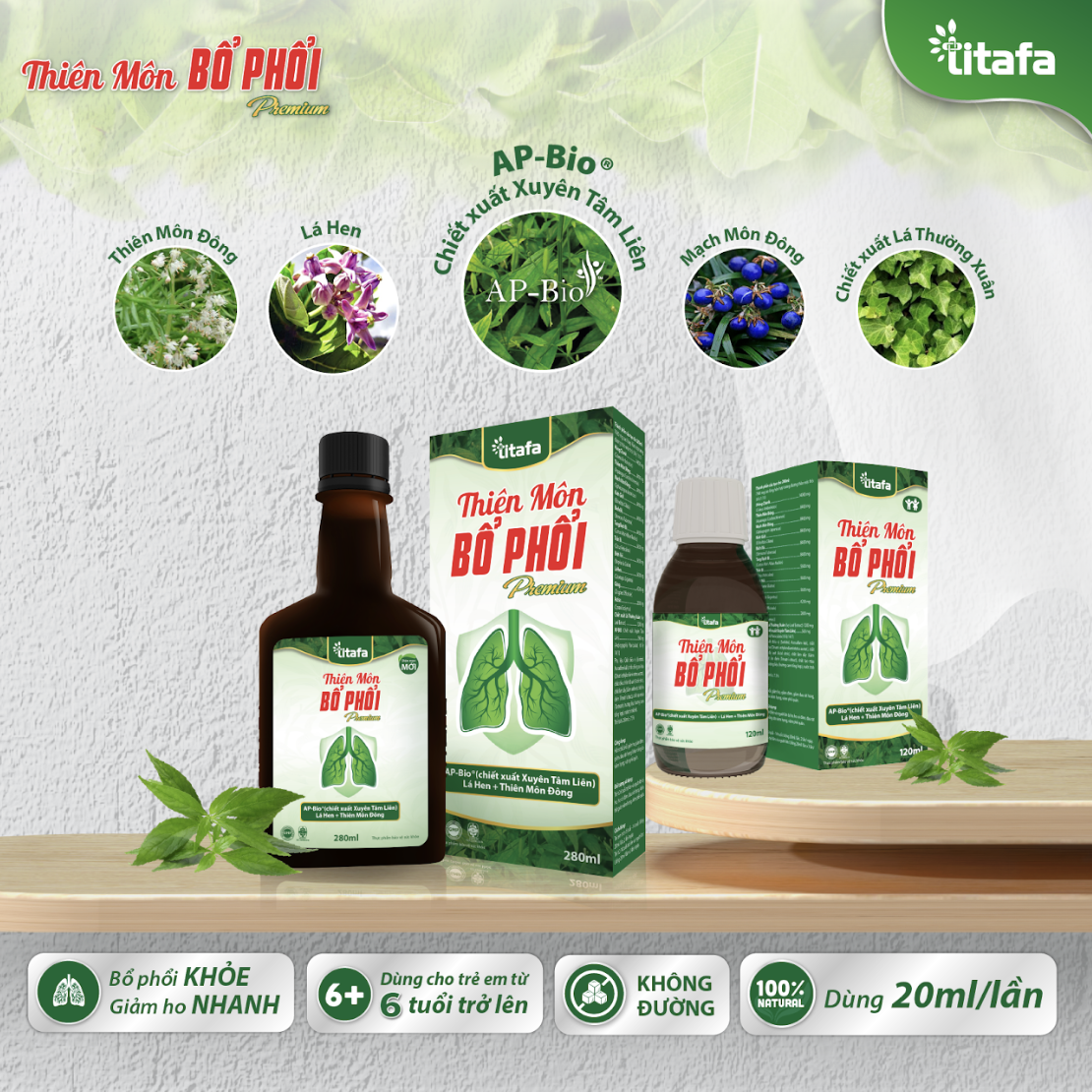 Thiên Môn Bổ Phổi Premium là thực phẩm bảo vệ sức khỏe dạng siro với công thức đặc biệt kết hợp AP-Bio® (chiết xuất Xuyên Tâm Liên chuẩn hóa 14:1) cùng 11 loại thảo dược quý.​