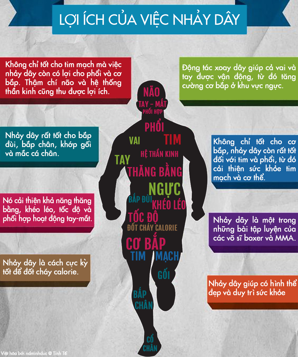 Nhảy dây giúp phát triển cơ bắp, cải thiện sức bền và nâng cao sức khỏe tim mạch. Hơn nữa, nó còn là bài tập chịu trọng lượng hiệu quả, giúp tăng mật độ xương, từ đó làm cho xương chắc khỏe hơn và giảm nguy cơ mắc bệnh loãng xương.
