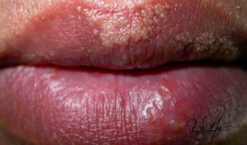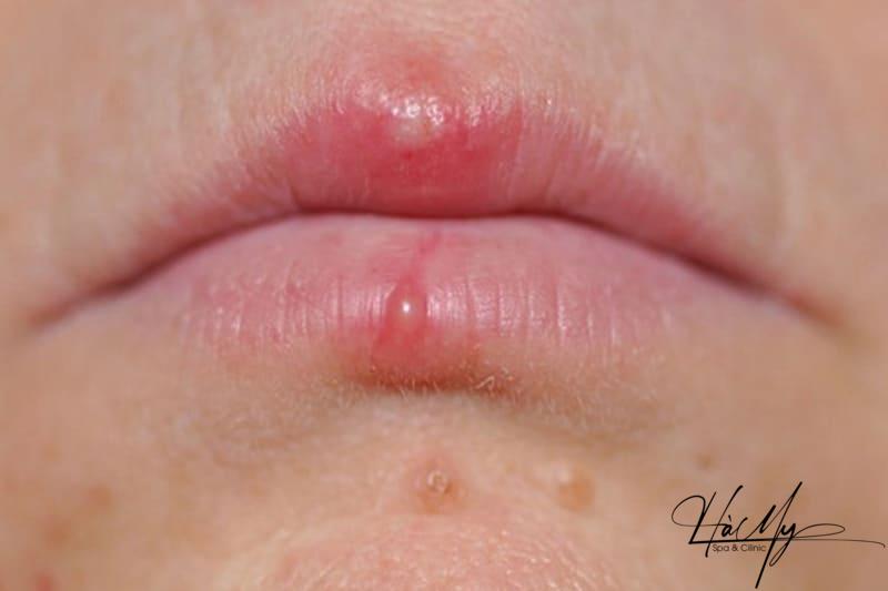 Sau khi bạn phun môi, khoảng 3-4 ngày sau, nếu thấy hai mép môi bắt đầu nổi các hạt mụn trắng nhỏ li ti và ngứa ngáy, có thể đây là dấu hiệu cho thấy môi bạn đang gặp vấn đề. Những hạt mụn trắng này thường liên quan đến hiện tượng herpes hoặc hạt fordyce. Herpes xuất hiện dưới dạng mụn nước chứa dịch bên trong, khi vỡ có thể gây lở loét ở môi.