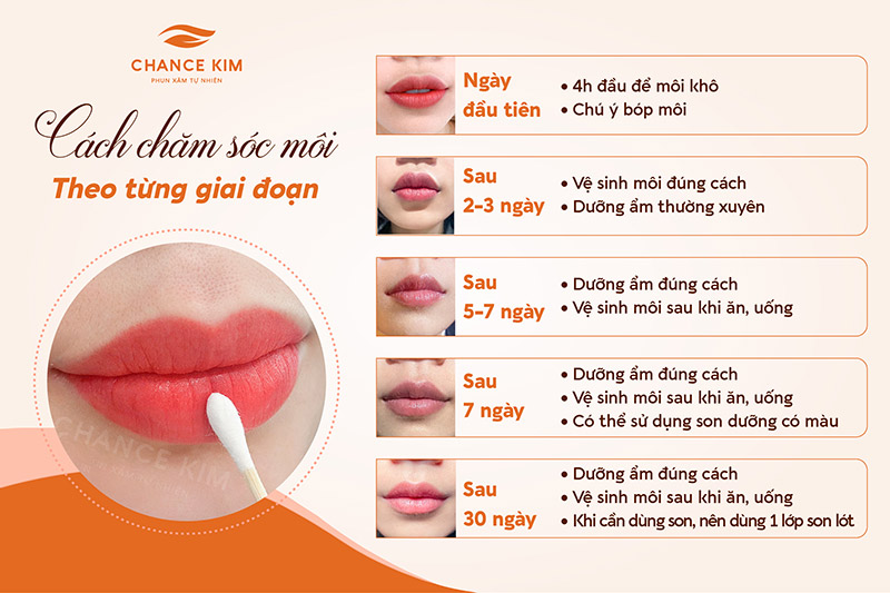 Nếu bạn có cơ địa khó lành, hãy kiêng thêm vài ngày, có thể kéo dài đến 2 tuần. Sau khoảng 10 – 14 ngày, bạn có thể bắt đầu ăn thoải mái hơn, nhưng vẫn nên tránh những món dễ gây sẹo hoặc thâm môi. Trong giai đoạn này, việc chăm sóc môi cũng rất quan trọng để đảm bảo màu sắc lên chuẩn nhất.