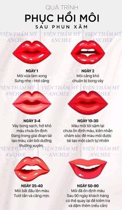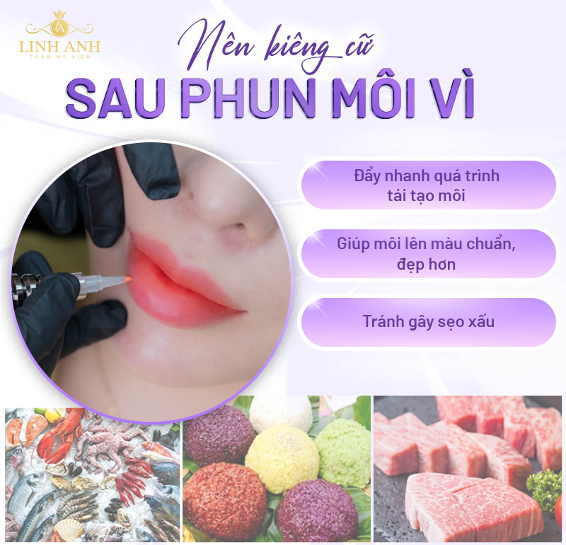 Sau khi phun môi, việc kiêng ăn là rất quan trọng để giúp môi hồi phục tốt và lên màu đẹp. Trong 1-3 ngày đầu tiên, bạn nên tránh tuyệt đối các loại thực phẩm như thịt gà, thịt bò, thịt vịt, đồ nếp, rau muống cùng các món ăn cay nóng. Đây là thời gian nhạy cảm, bởi chế độ ăn uống không hợp lý có thể gây sưng hoặc mưng mủ.
