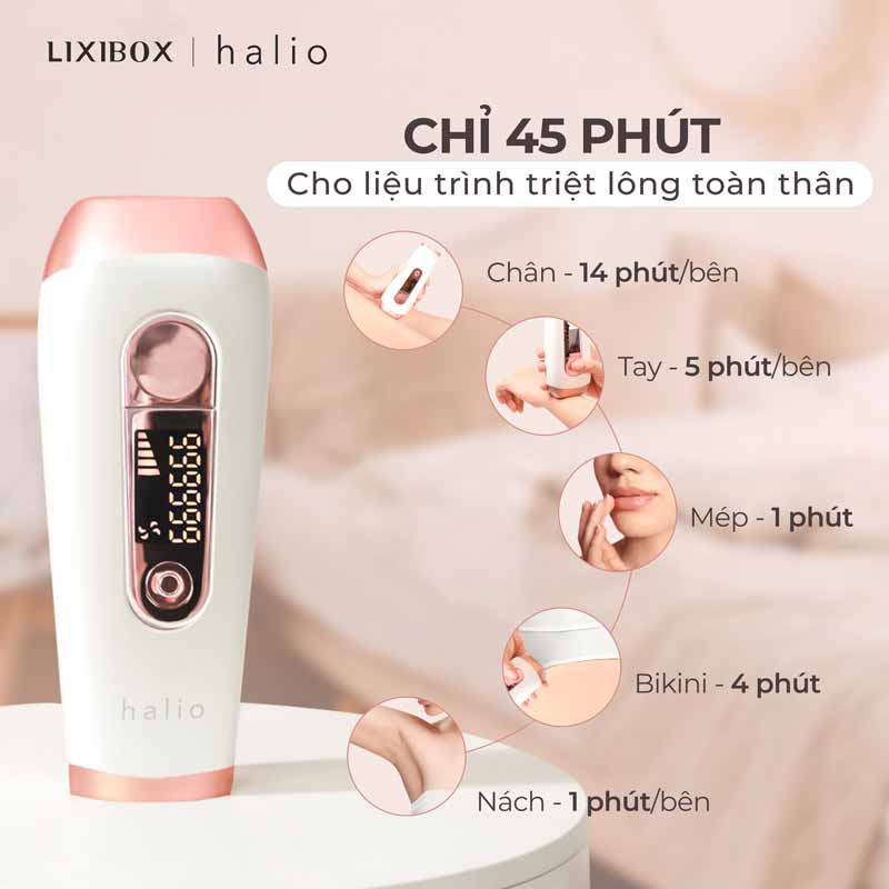Máy triệt lông Halio là một thiết bị triệt lông cá nhân rất được ưa chuộng nhờ công nghệ IPL (Intense Pulsed Light) hiện đại kết hợp với đầu lạnh IPL Cooling giúp làm mát da khi triệt, giảm cảm giác đau rát hiệu quả. Máy có tới 999.999 xung ánh sáng, cho phép sử dụng lâu dài mà không lo hết xung nhanh. Thiết kế của Halio nhỏ gọn, màu trắng hồng nữ tính, cầm chắc tay, dễ thao tác trên nhiều vùng da khác nhau.