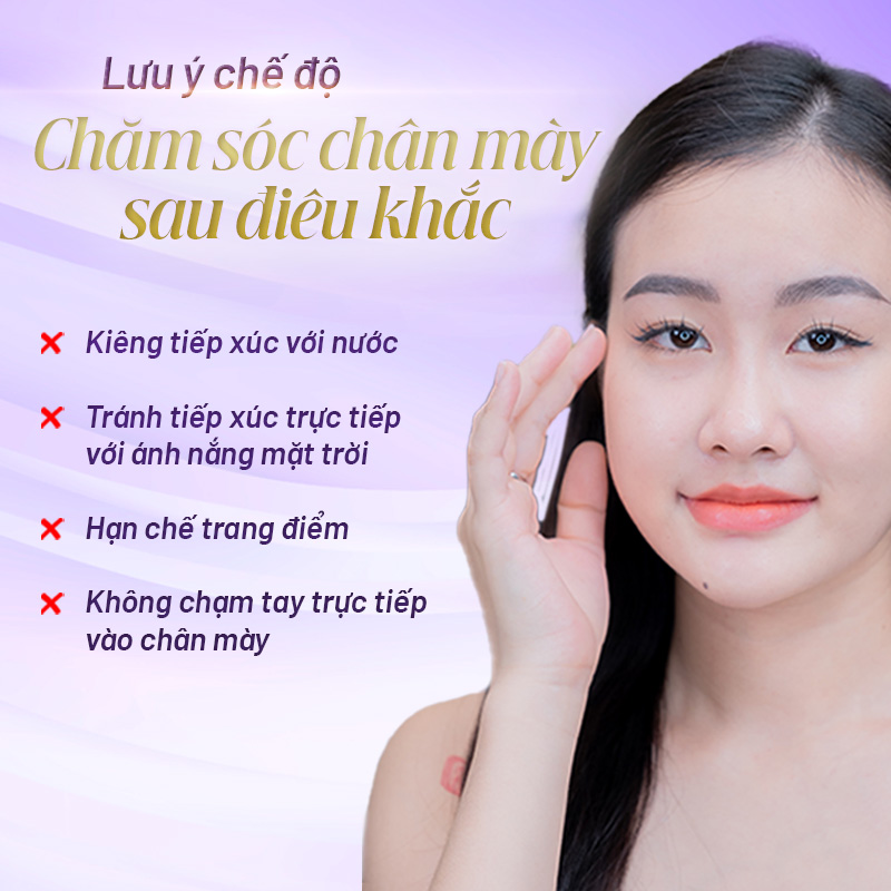 Sau khi điêu khắc lông mày, việc kiêng cữ là rất quan trọng để đảm bảo kết quả đẹp và bền lâu. Trong 48 giờ đầu, bạn cần tuyệt đối tránh nước để không làm ảnh hưởng đến màu mực vừa mới thực hiện. Nếu muốn vệ sinh khu vực này, hãy dùng khăn ẩm và nhẹ nhàng lau xung quanh mà không làm ướt lên chân mày.