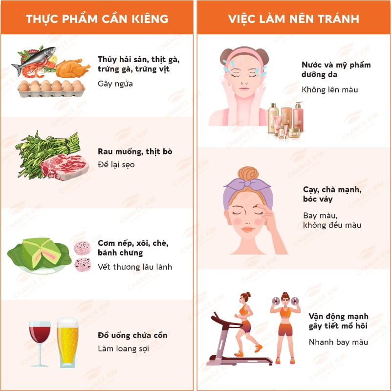 Ngoài việc kiêng nước, bạn cũng nên tránh các chất kích thích như rượu, bia, và thuốc lá. Những thực phẩm như hải sản, thịt gà, thịt bò hay đồ nếp cũng là những món ăn cần kiêng, vì chúng có khả năng gây kích ứng và làm chậm quá trình phục hồi. Rau muống, với khả năng làm tăng sinh tế bào, cũng nên được loại khỏi thực đơn trong thời gian này.