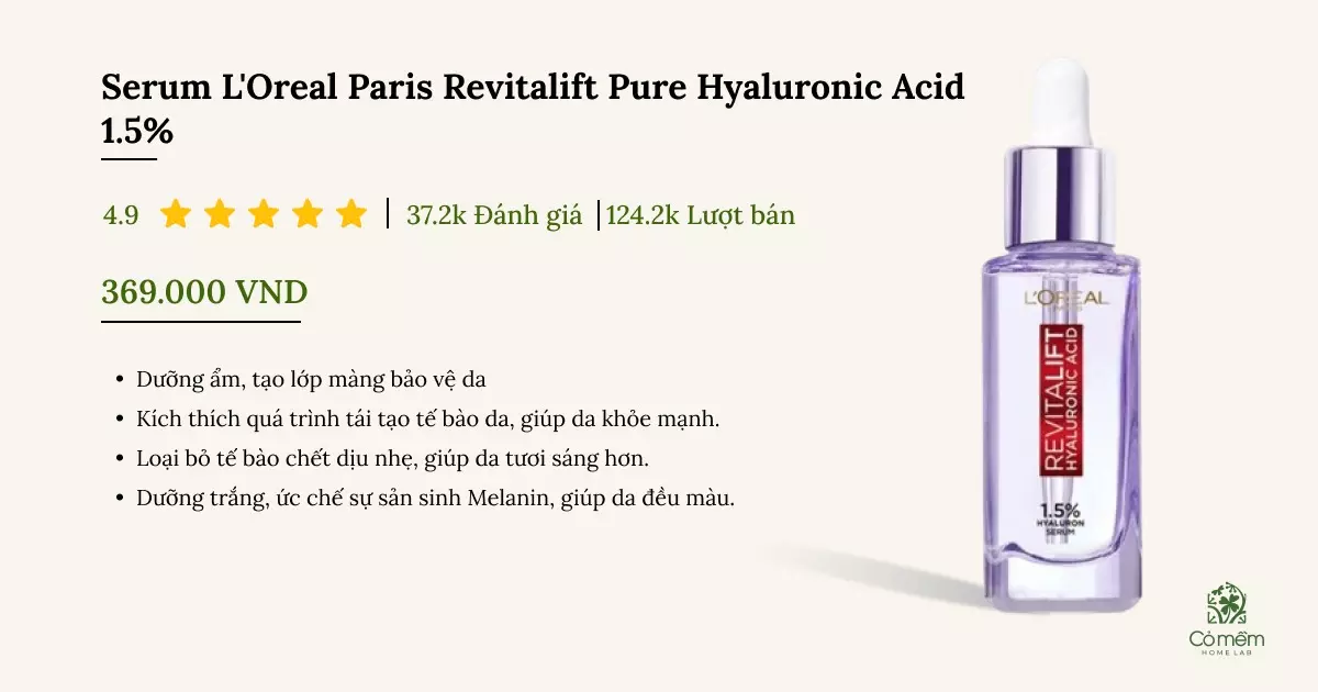 Một trong những loại serum HA nổi bật là serum L’Oreal với giá khoảng 499.000 VNĐ cho 30ml, giúp cấp ẩm và sáng da hiệu quả. Đối với những ai muốn đầu tư nhiều hơn cho làn da, serum H.A. Intensifier đến từ thương hiệu Skinceuticals có giá cao hơn nhưng hứa hẹn mang lại kết quả cải thiện rõ rệt.