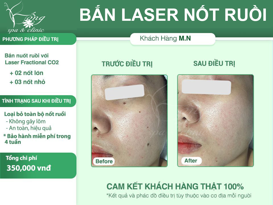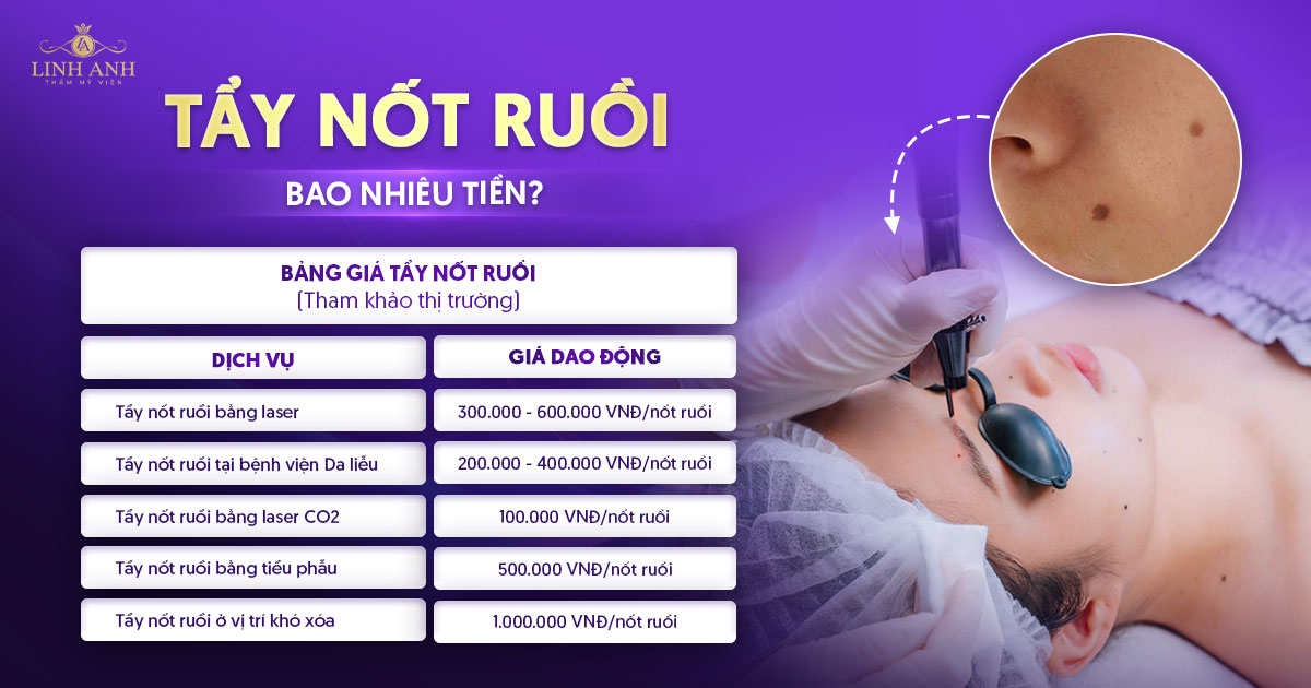 Tẩy nốt ruồi bằng tia laser ngày càng trở nên phổ biến nhờ vào hiệu quả nhanh chóng và an toàn. Tại các cơ sở thẩm mỹ, giá cho dịch vụ này thường dao động khá rộng, khoảng từ 300.000 VNĐ đến 600.000 VNĐ cho mỗi nốt ruồi, tùy thuộc vào tình trạng và vị trí của nốt.