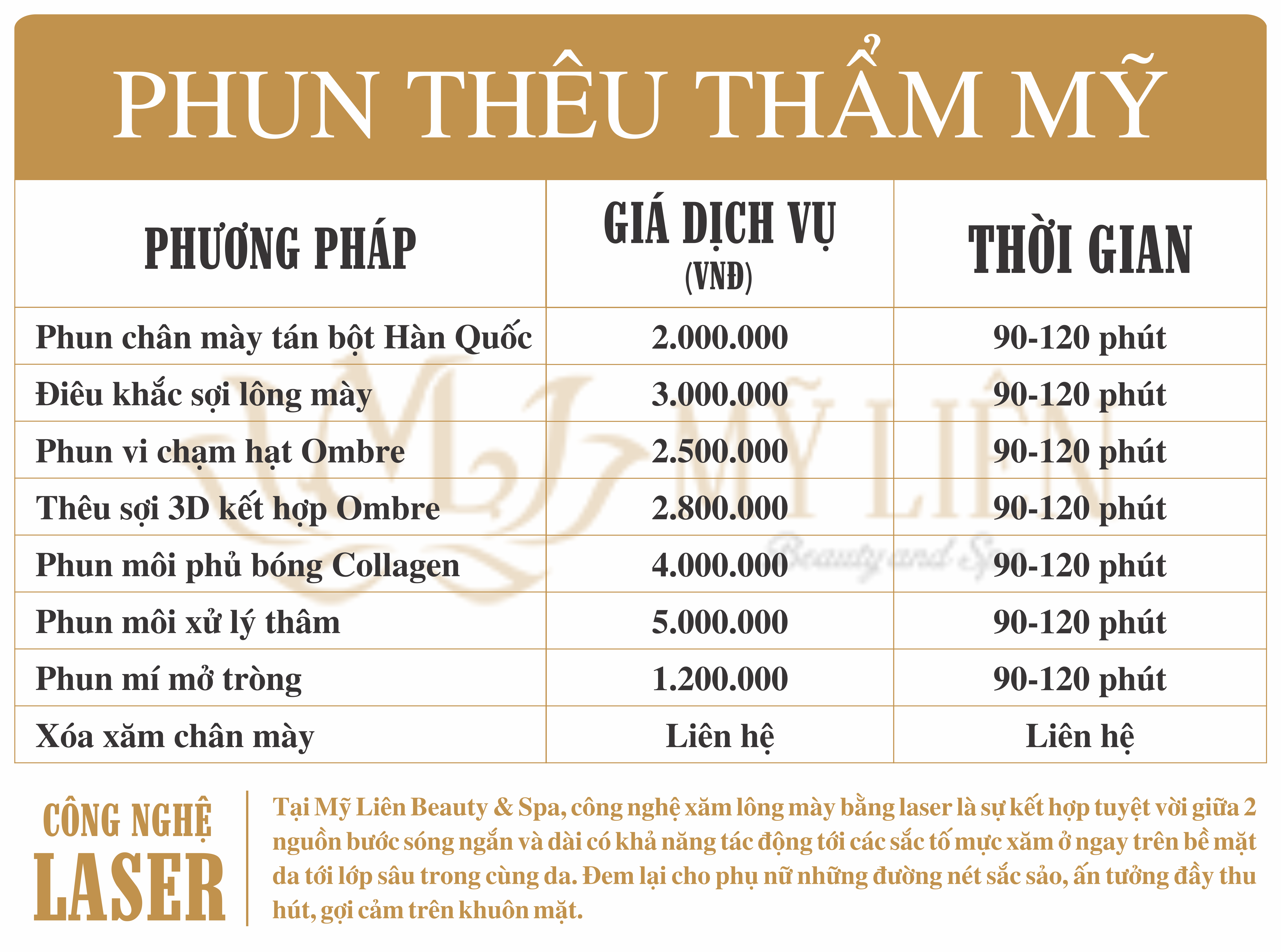 Ngoài ra, mức giá còn phụ thuộc vào tay nghề chuyên viên, loại mực sử dụng và trang thiết bị của nơi làm đẹp. Một số thẩm mỹ viện uy tín có thể đưa ra bảng giá chi tiết với nhiều lựa chọn khác nhau, từ thêu truyền thống đến phun thêu công nghệ cao.