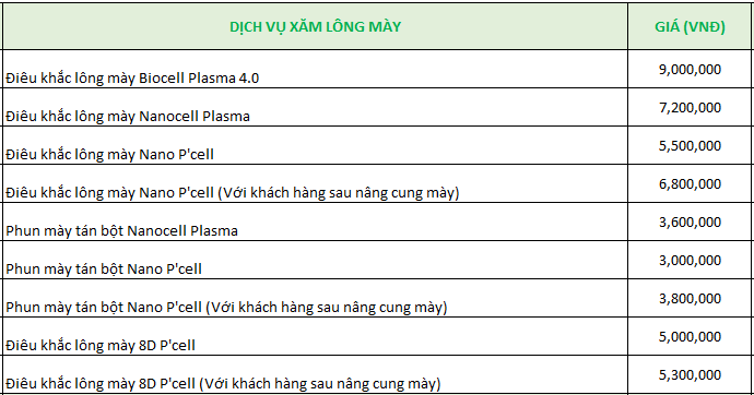| Điêu khắc chân mày Microblading | 1.000.000 – 7.000.000 |