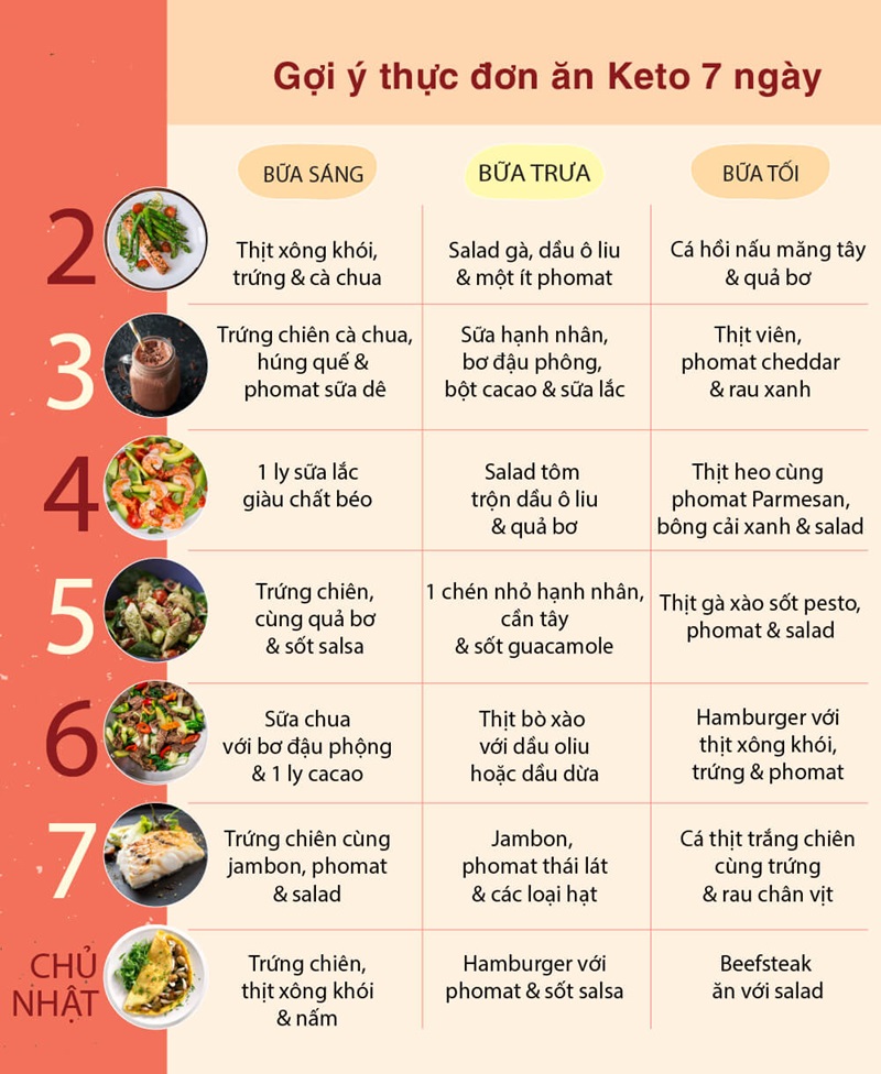 Với chế độ ăn này, bạn sẽ cắt giảm tinh bột xuống dưới 5% và tăng cường chất béo cùng protein, giúp cơ thể dễ dàng đốt mỡ thừa. Nếu bạn muốn thử sức với thực đơn khác, hãy nghĩ đến việc ăn thịt bò hun khói và cà chua vào bữa sáng, tiếp theo là salad mực, trứng chiên cho bữa trưa, và không thể thiếu cá hồi với đậu cove cho bữa tối.