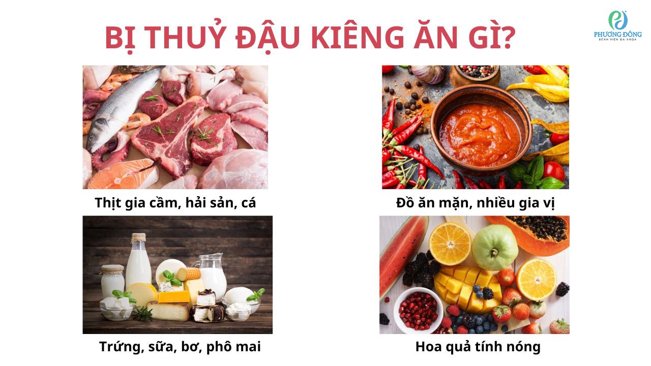 Về mặt dinh dưỡng, một số loại thực phẩm như vải, nhãn, mận, xoài và mít là những thứ cần phải tránh xa. Các món ăn cay nóng, chua, nhiều đường hay hải sản cũng không tốt cho người bệnh, vì chúng có thể gây dị ứng và làm chậm quá trình lành vết thương. Đặc biệt, trẻ em mắc thủy đậu nên kiêng các loại thịt như thịt chó, dê, cùng những đồ ăn nhiều dầu mỡ hoặc đồ chiên giòn.