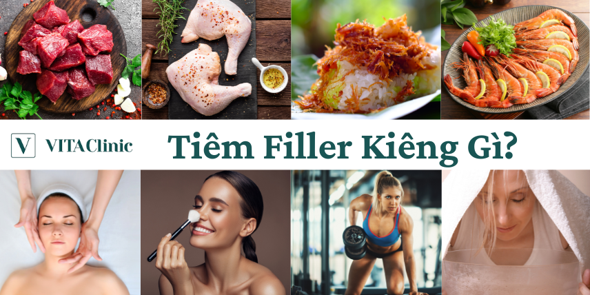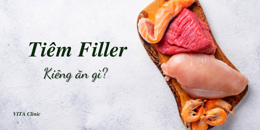 Về ăn uống, bạn nên kiêng hải sản, thịt bò, thịt gà, trứng gà và rau muống. Hải sản và thịt bò dễ gây dị ứng, ngứa ngáy, còn thịt gà, trứng gà có thể làm vùng tiêm bị thâm hoặc kích ứng, khiến vết thương lâu lành. Rau muống chứa chất kích thích tăng sinh collagen, dễ gây sẹo lồi không đều màu ở vùng tiêm filler.