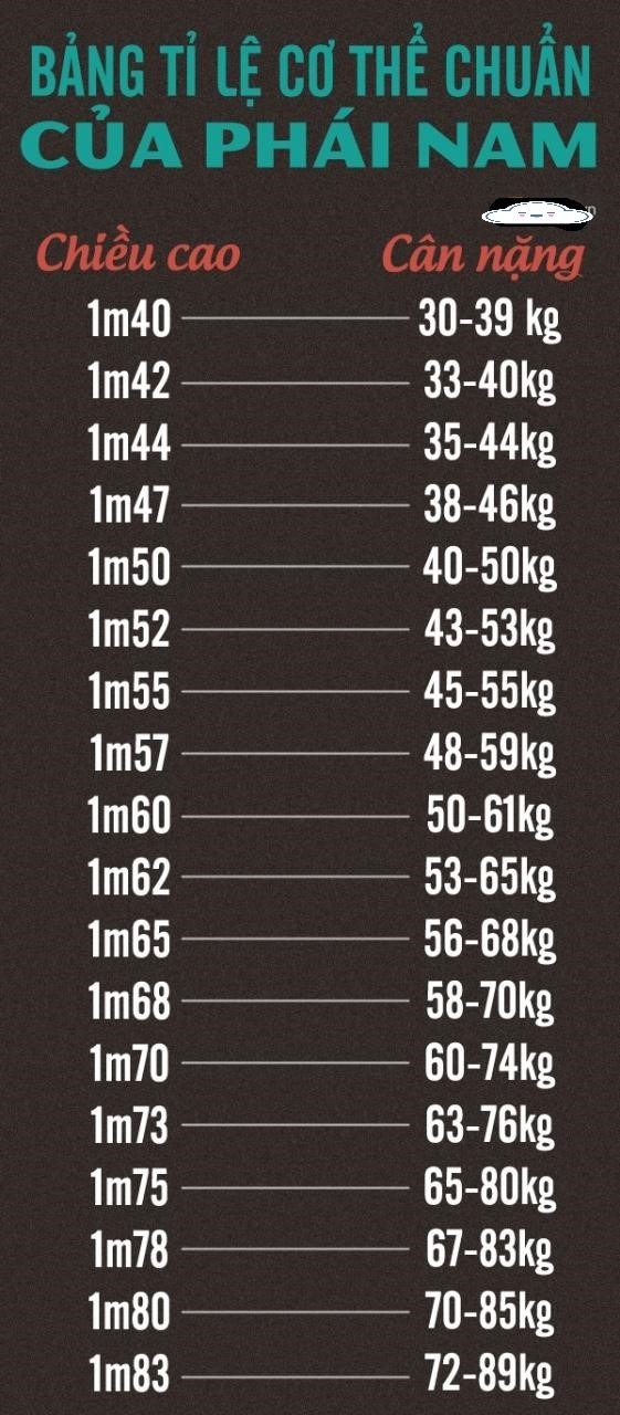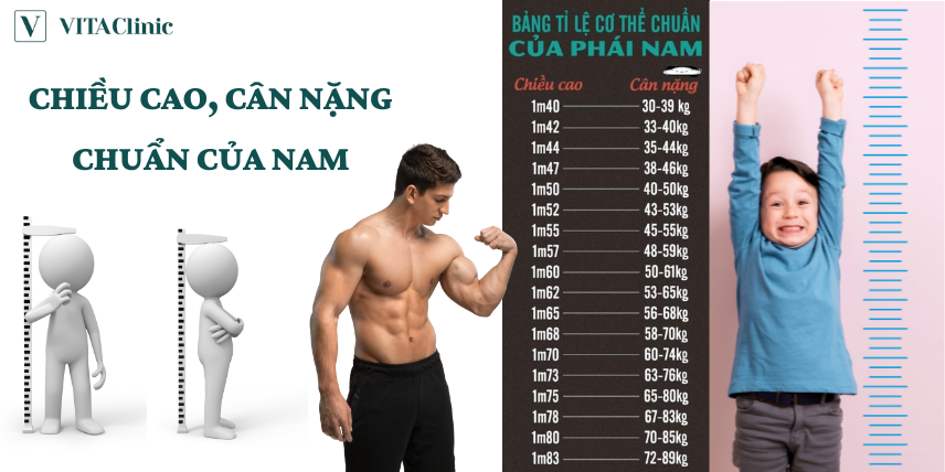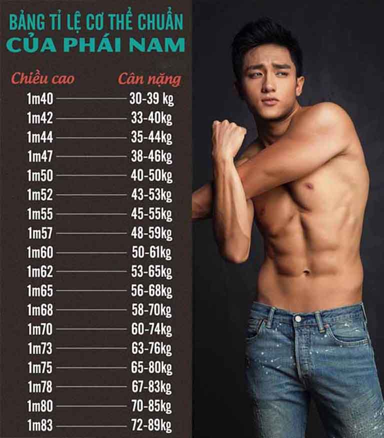 Tiêu chuẩn chiều cao và cân nặng cho nam giới là một chủ đề quan trọng trong việc duy trì sức khỏe và hình thể. Các chỉ số này thường được sử dụng để xác định liệu một người có đang ở trong khoảng cân nặng lý tưởng hay không. Chẳng hạn, với chiều cao 1m40, cân nặng chuẩn dao động từ 30,8 đến 38,1 kg, trong khi ở chiều cao 1m70, khoảng cân nặng lý tưởng có thể lên đến 63-72 kg.