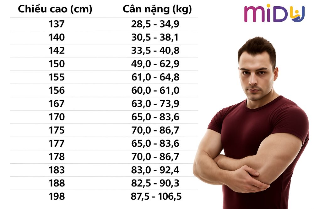 Chỉ số cân nặng chuẩn theo chiều cao của nam giới là một thước đo rất quan trọng để đánh giá sức khỏe. Để xác định tình trạng cân nặng, người ta thường sử dụng chỉ số BMI (Body Mass Index). Theo đó, nếu BMI dưới 18,5, người đó sẽ được xem là thiếu cân. Từ 18,5 đến 24,9 là mức cân nặng khỏe mạnh, còn từ 25 đến 29,9 được coi là thừa cân. Người có BMI trên 30 thì được xếp vào nhóm béo phì.