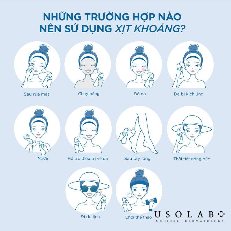 Xịt khoáng là sản phẩm rất hữu ích trong việc chăm sóc da hàng ngày. Bạn có thể sử dụng xịt khoáng bất cứ lúc nào cảm thấy da mình khô căng hay ngứa ngáy, đặc biệt là sau khi you ra nắng về. Xịt khoáng không chỉ giúp làm dịu da mà còn bổ sung độ ẩm cần thiết cho làn da, giúp bạn cảm thấy thoải mái hơn.