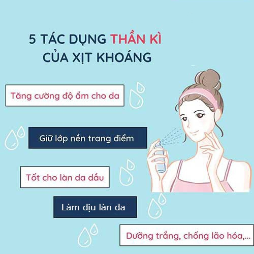 Ngoài ra, xịt khoáng còn có tác dụng khóa lớp trang điểm, giúp màu sắc lâu trôi hơn. Không chỉ vậy, sản phẩm này còn giúp điều tiết dầu trên da, giữ cho làn da luôn khô thoáng. Thậm chí, xịt khoáng còn có khả năng chăm sóc tóc, giúp mái tóc bạn mềm mượt hơn. Tóm lại, xịt khoáng là một sản phẩm không thể thiếu nếu bạn muốn có làn da khỏe mạnh và hỗ trợ chống lão hóa!